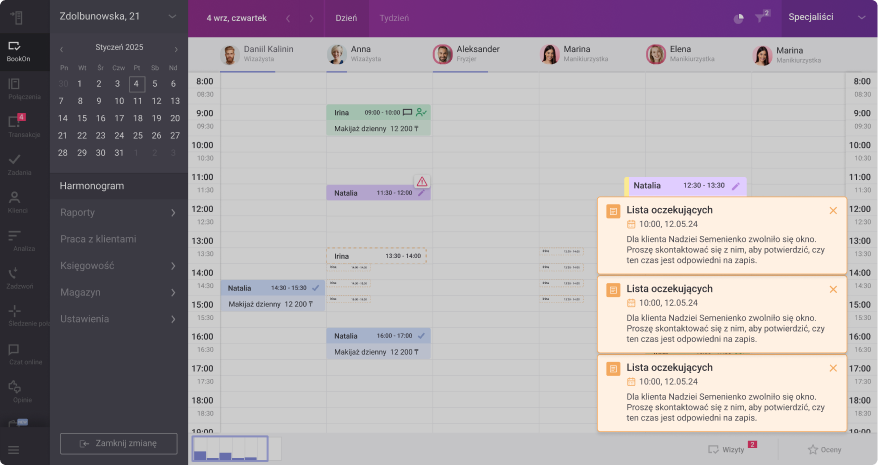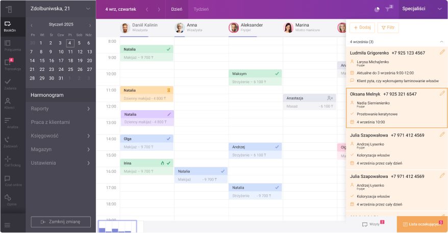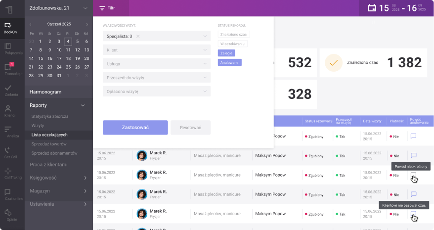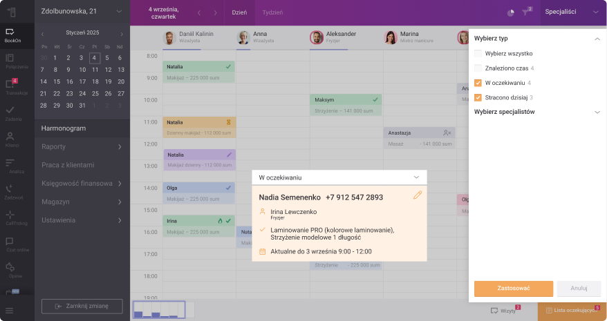 Wygodne filtry umożliwiają przegląd zapisów według specjalistów, statusów, usług lub daty. Potrzebne informacje znajdziesz w kilku kliknięciach.
